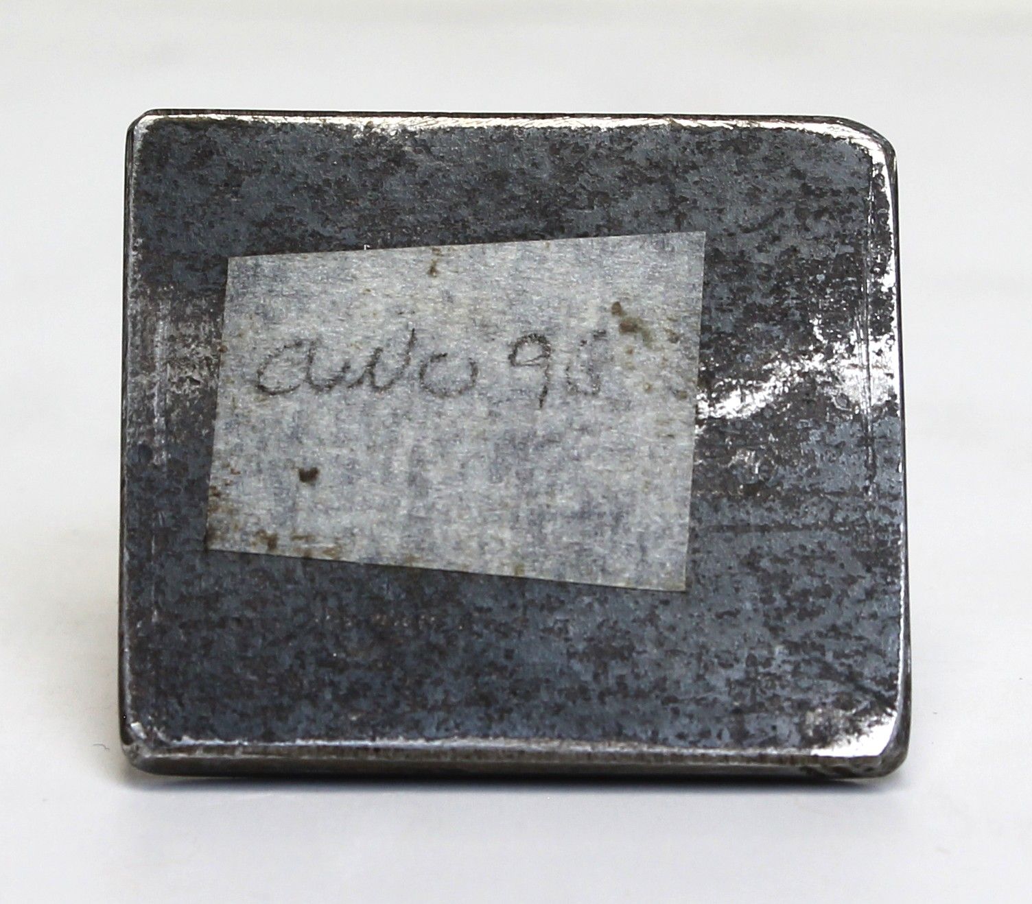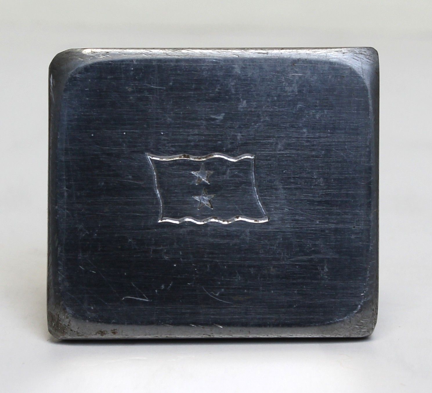 Pieza de metal rectangular, con relieve para imprimir una banderola con dos estrellas al centro, de tamaño pequeño. Sucia.