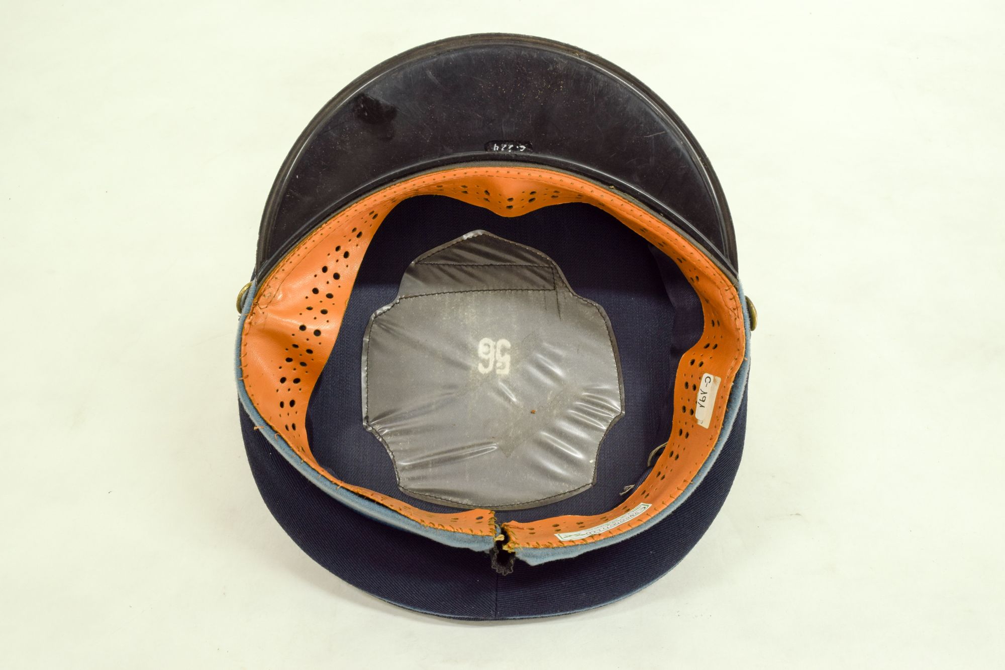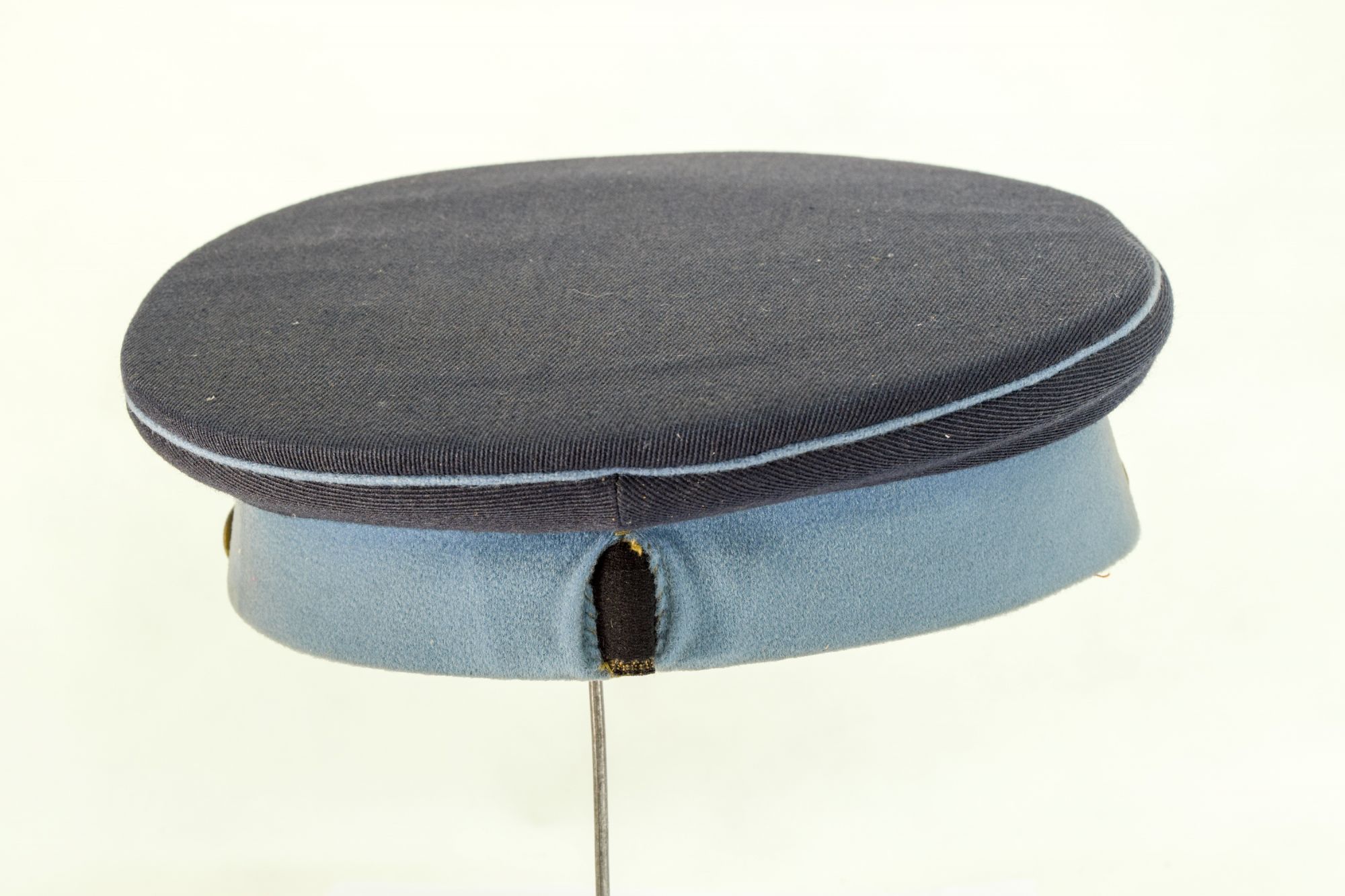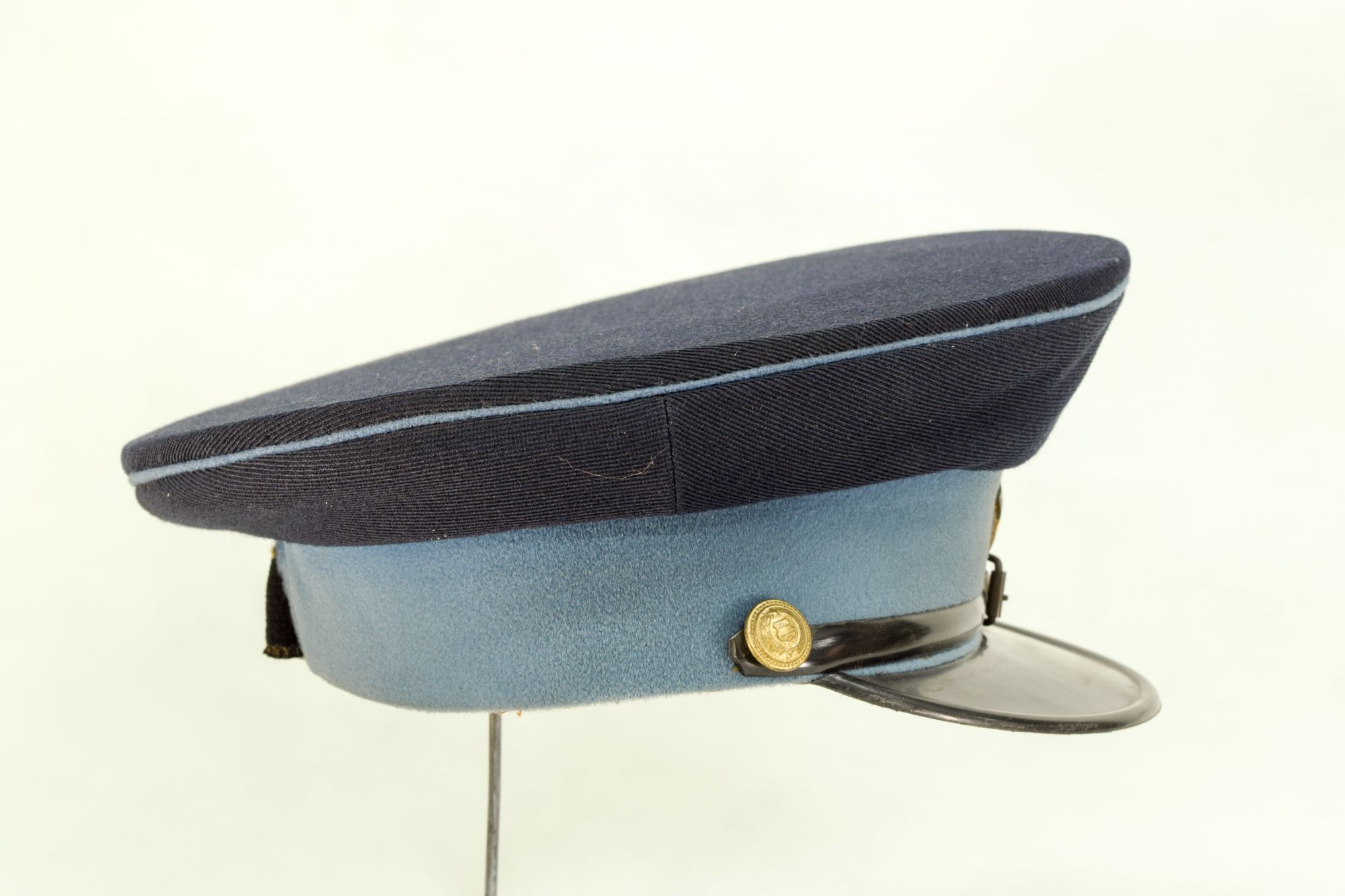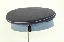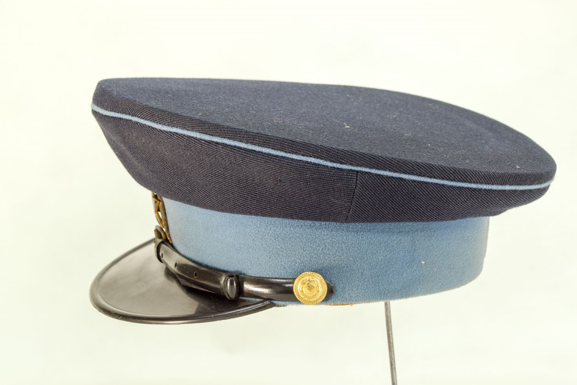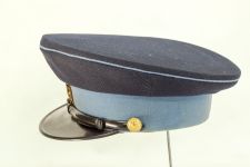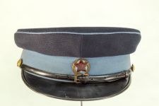Gorra de paño de color azul con banda y vivos celeste, visera de color negro, y el barbiquejo también. En el frente en metal esmaltado amarillo, hay una insignia que tiene como tema central una estrella roja de cinco puntas entre laureles.