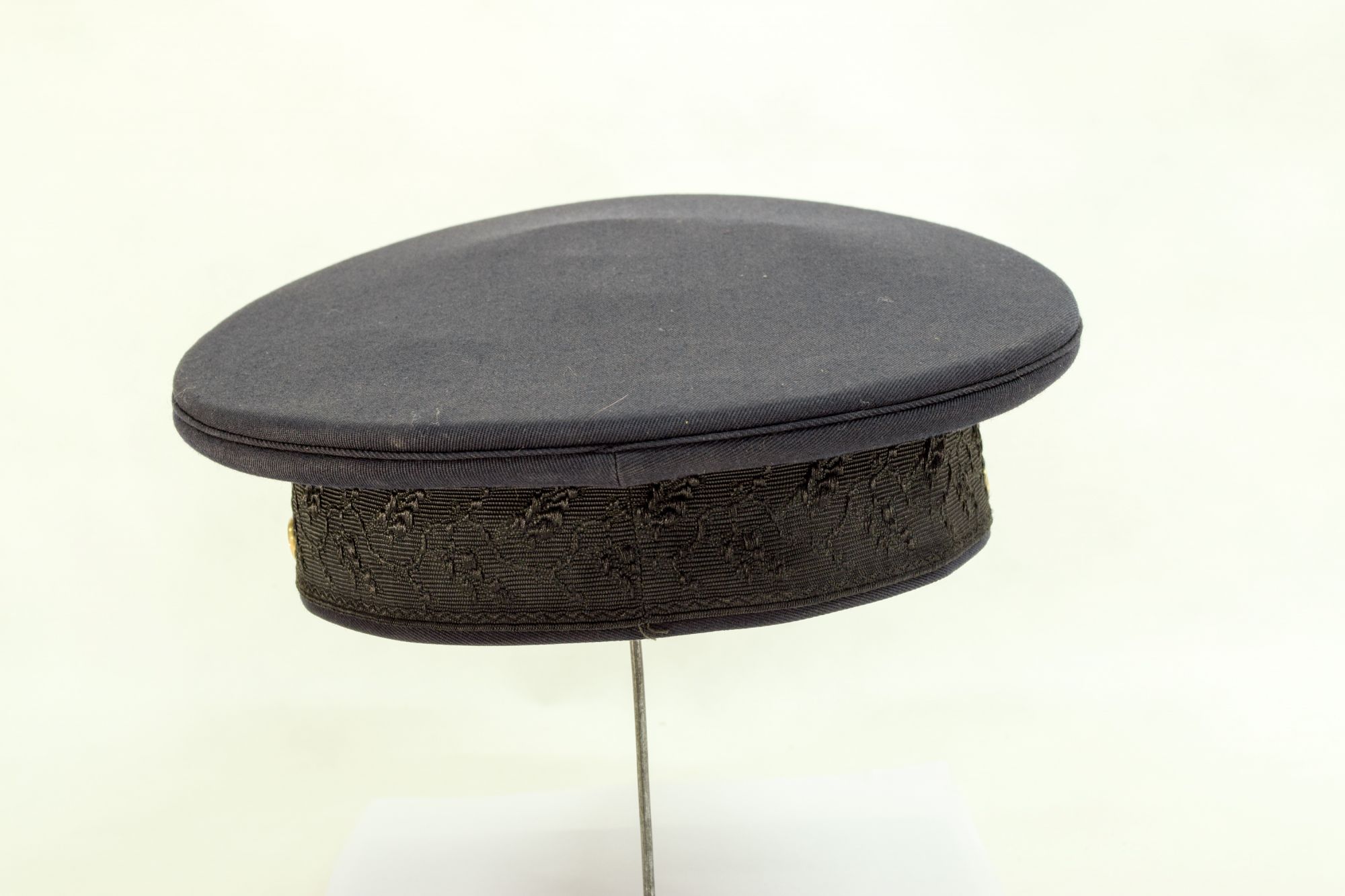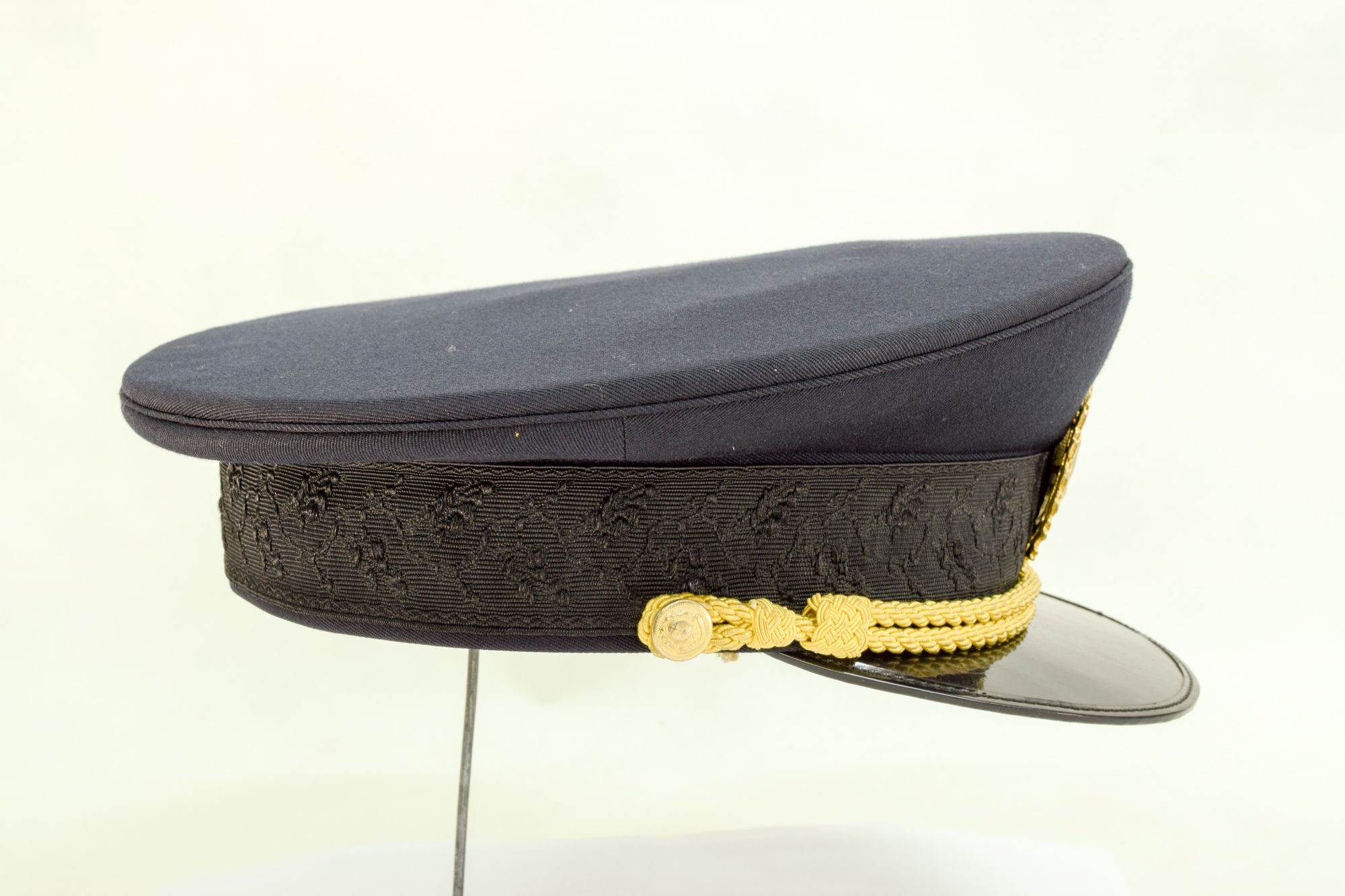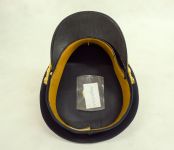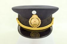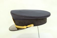 Gorra de color azul negro, con banda de paño negro, y visera de suela negro brillante. Barbiquejo de dos cordones dorados. En frente sobre la banda, el escudo nacional argentino en metal dorado, y sobre éste una cucarda grande de colores blanco y celeste.