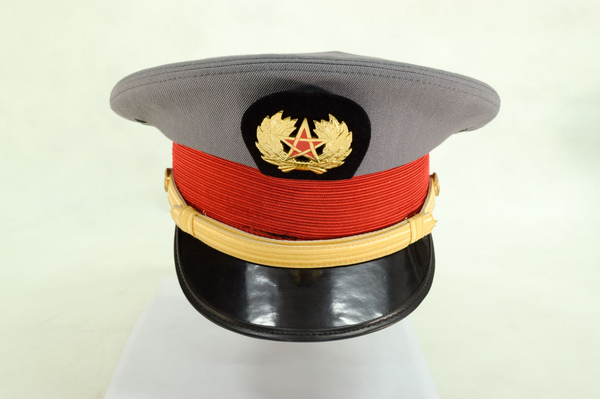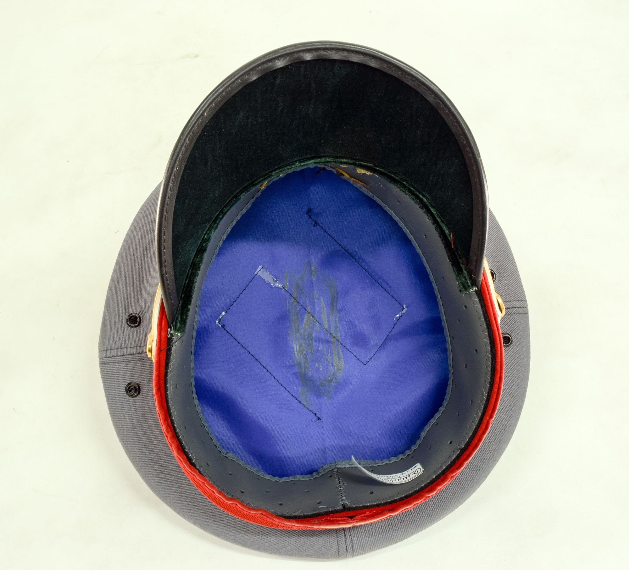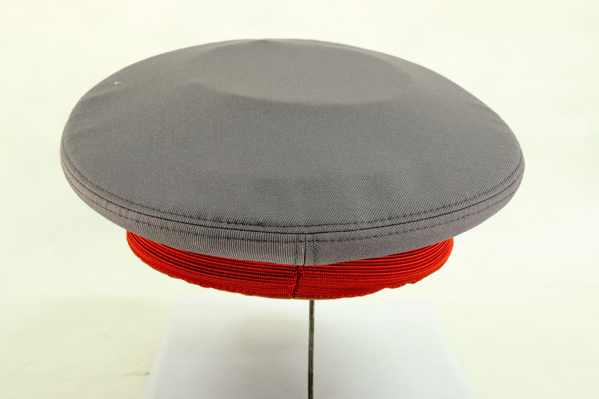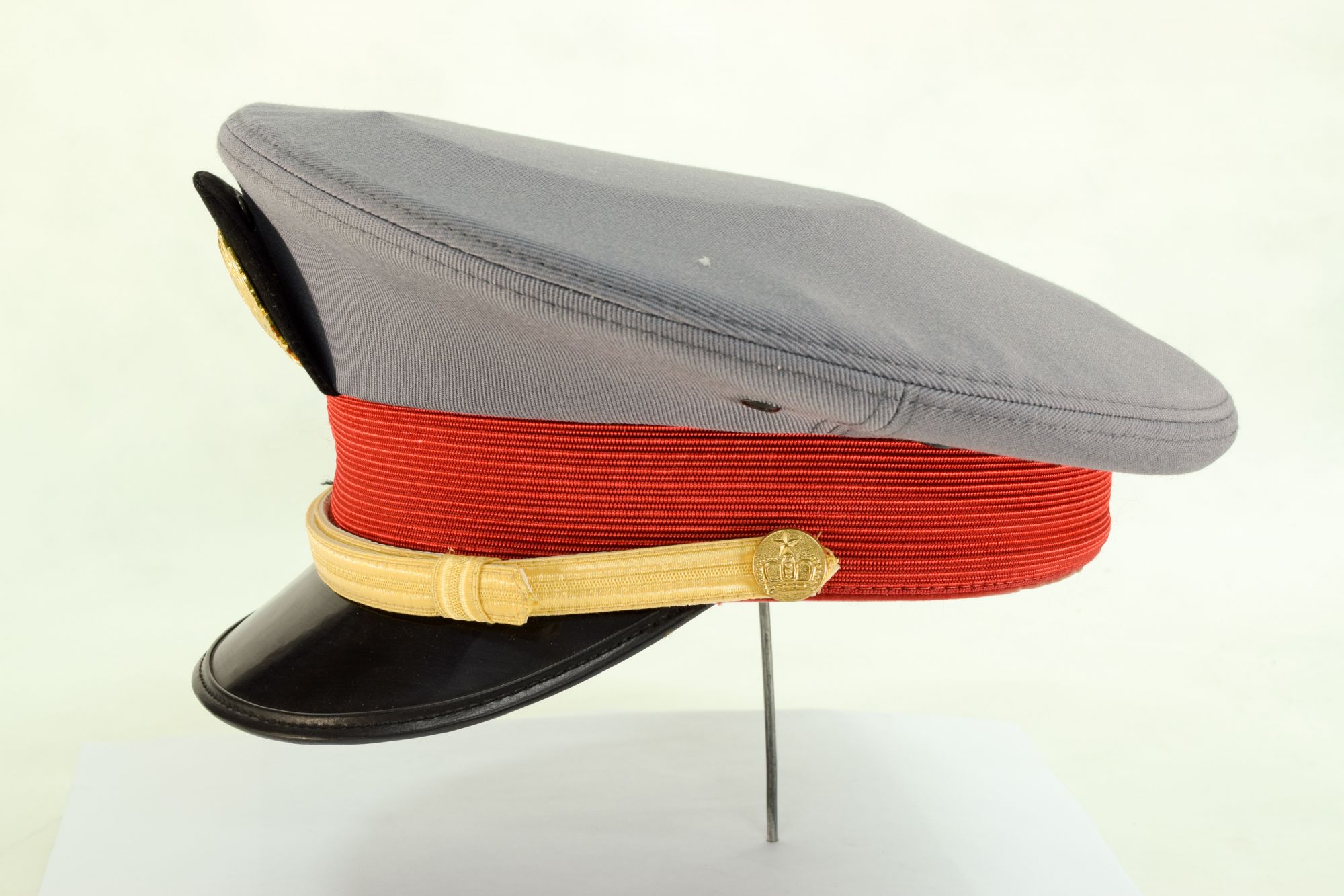 Gorra de gabardina color gris con banda elástica de color rojo, visera negra acharolada. Barbiquejo de cinta dorada. Sobre la frente y sobre un parche negro, en metal dorado esmaltado en rojo, la estrella de Salomón en cinco puntas insignia del Reino.