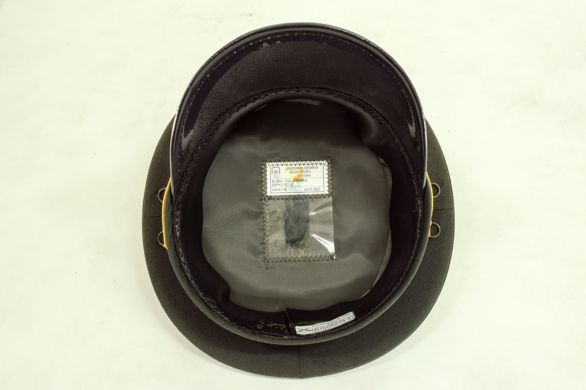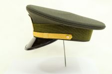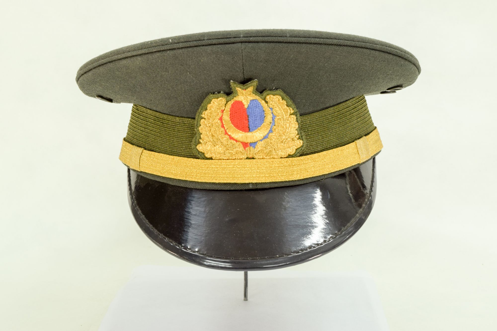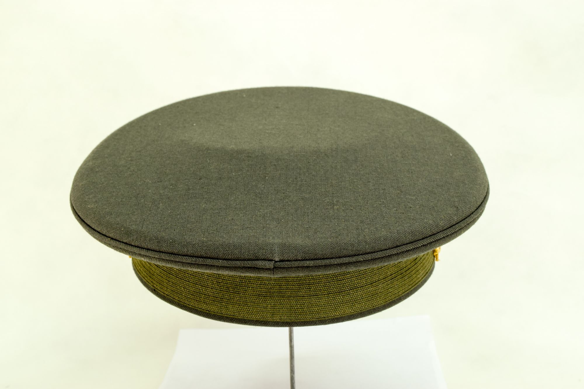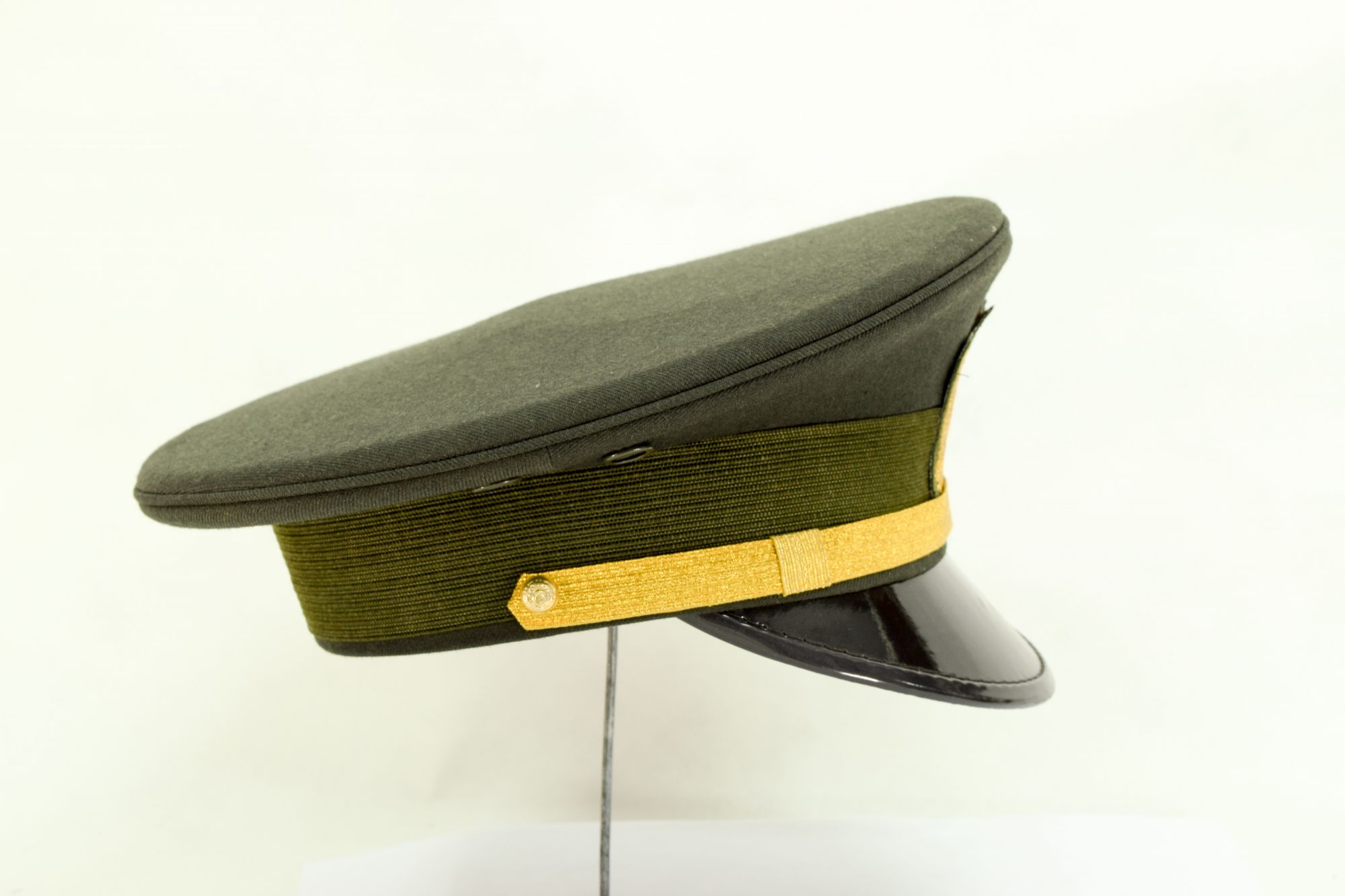 Gorra de gabardina de color verde oliva oscura con banda elasticada del mismo color, visera negra acharolada con barbiquejo dorado y en el frente de la banda un parche del mismo color verde lleva insignia dorada con media luna y estrella sobre fondo rojo y azul.