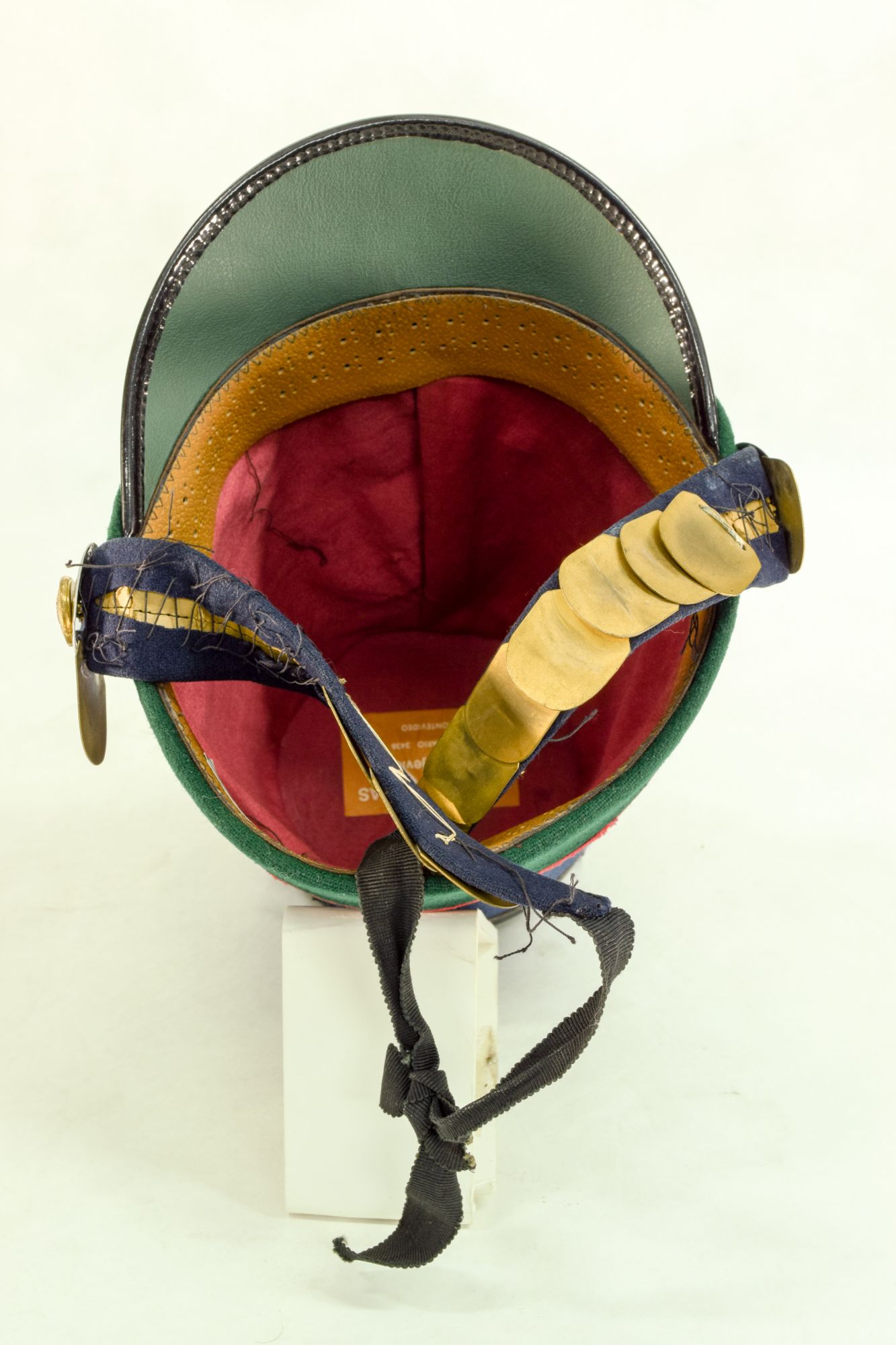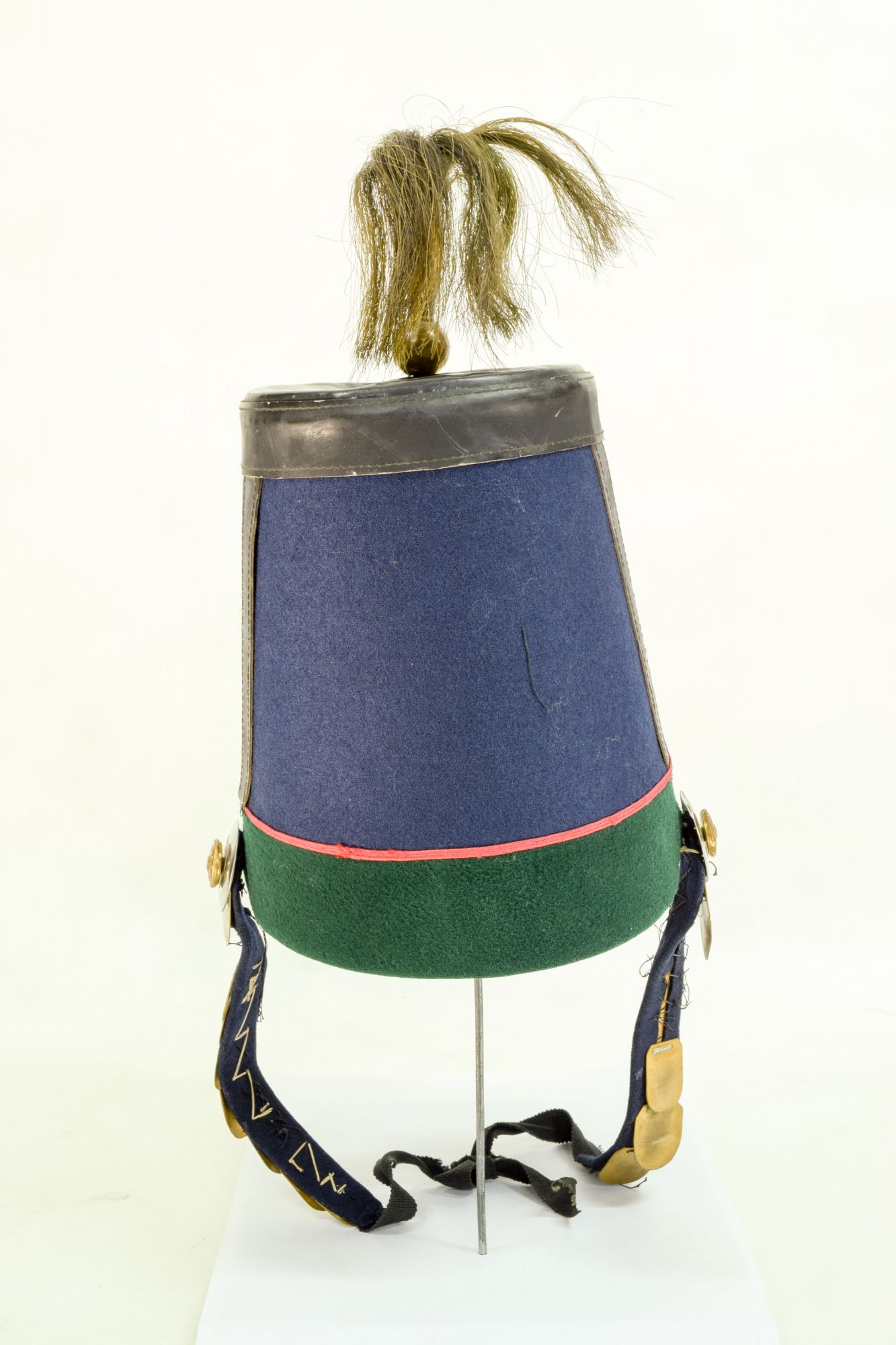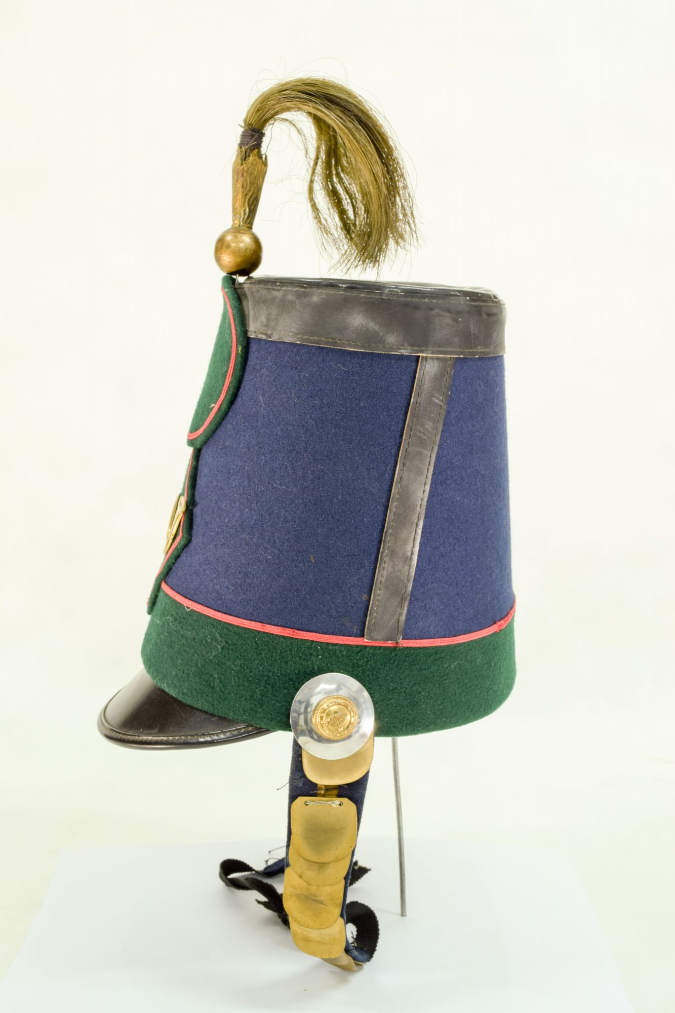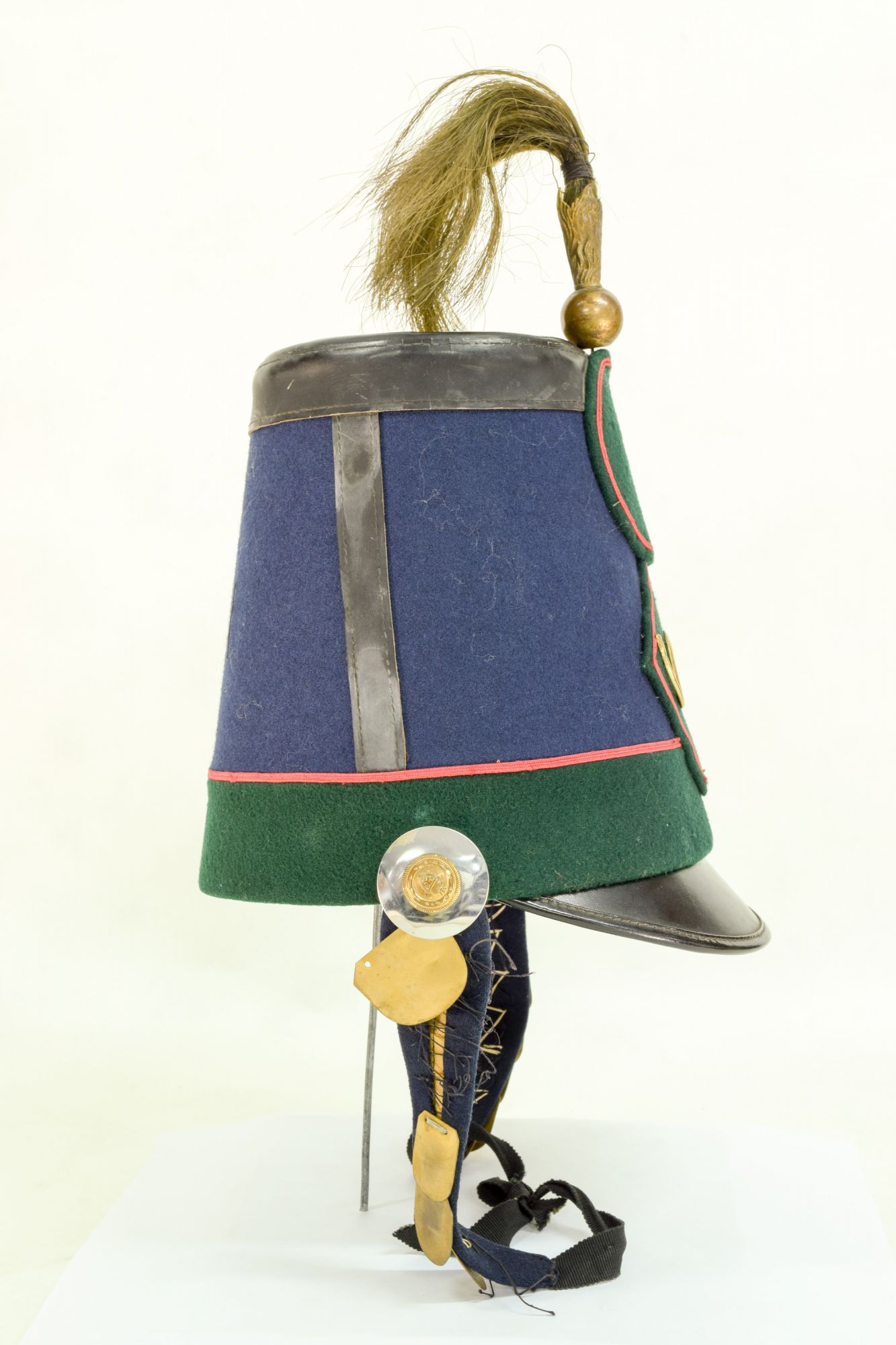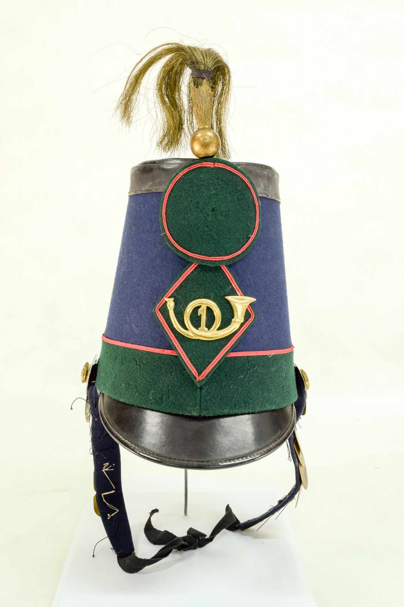 De material de suela o cuero, en la copa negra y cubierto en su banda por paño azul, la parte baja de la banda es de color verde y todos los vivos son de color rojo. En la frente la insignia en metal dorado del Cazadores N°1, un cuerno con el 1, todo dentro de un parche con forma de rombo, y sobre éste otro parche circular de paño verde con orillas rojas en donde falta una escarapela tejida. Sobre la frente en la copa, una esfera de metal con una plumas de tipo sintética con forma de coirón en color verdoso, parecido a la paja. Barbiquejo es de placas de metal dorado, pero incompleto.