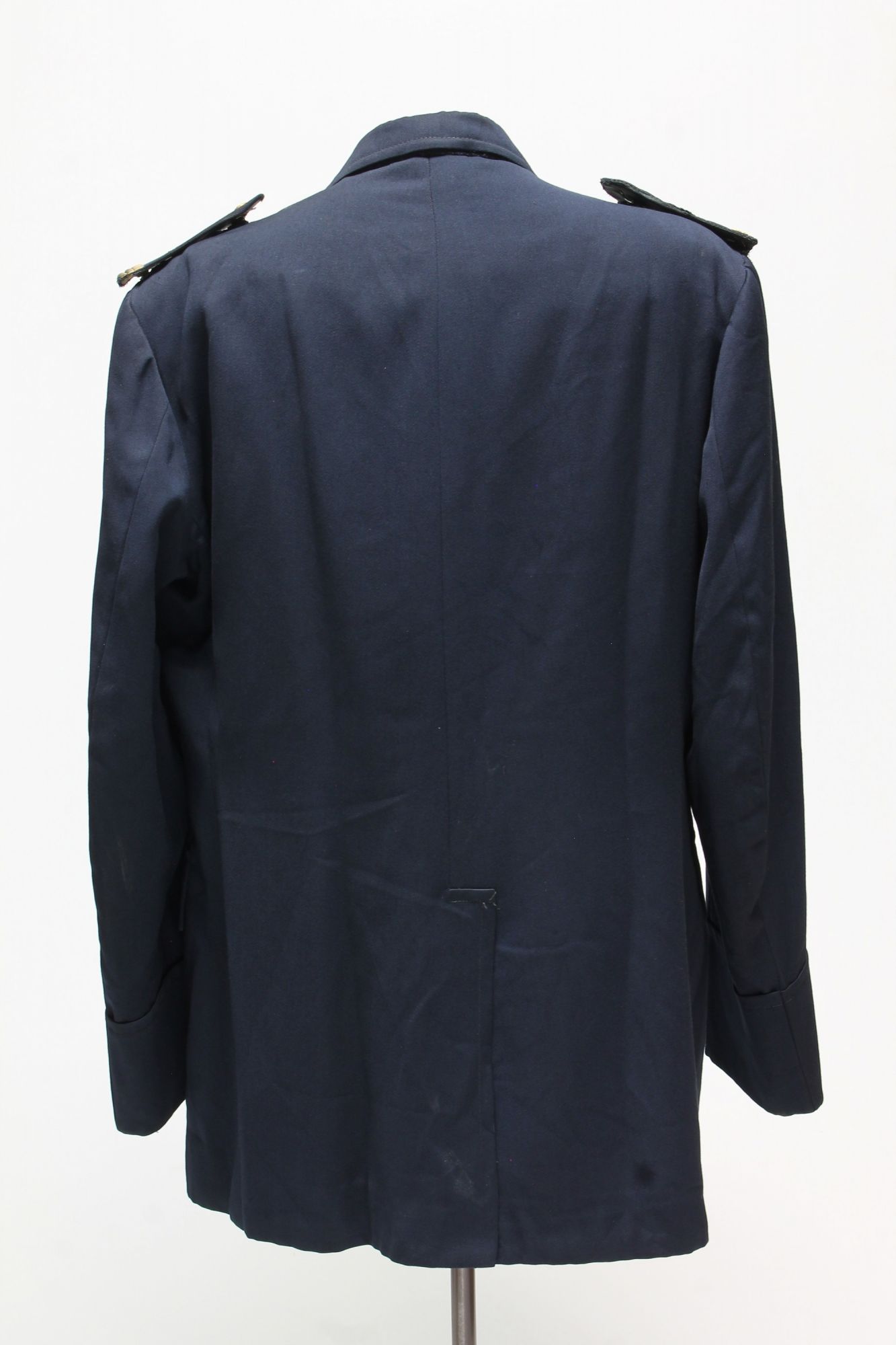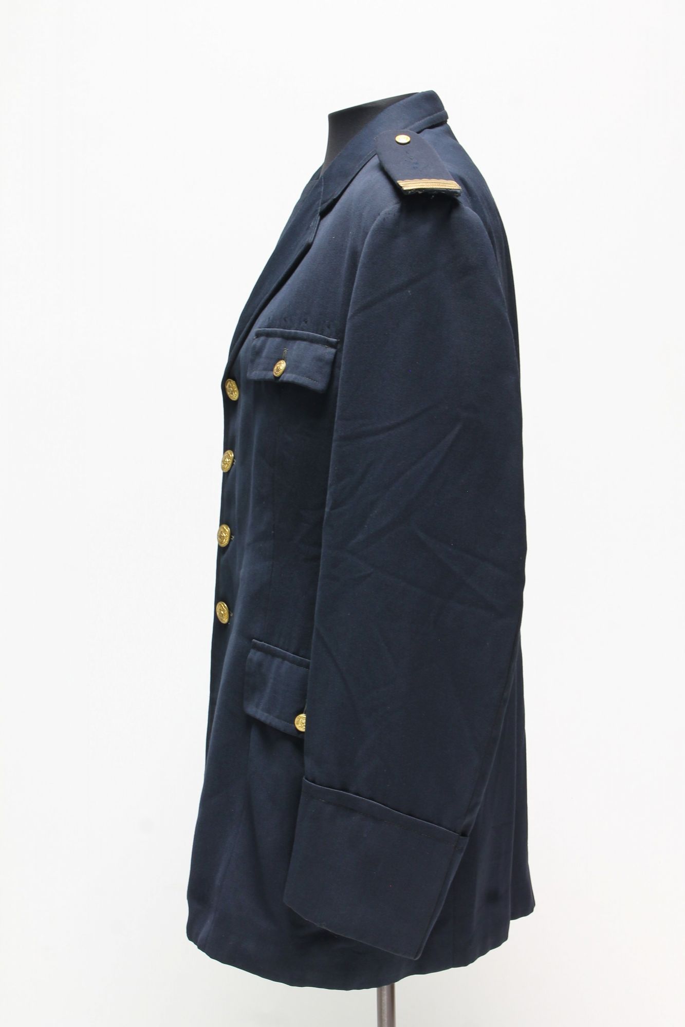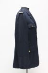 Blusa de gabardina color azul con cuatro bolsillos y botones de metal amarillo con escudo nacional en él. En las presillas, palas con grados de oficial incompletos.
