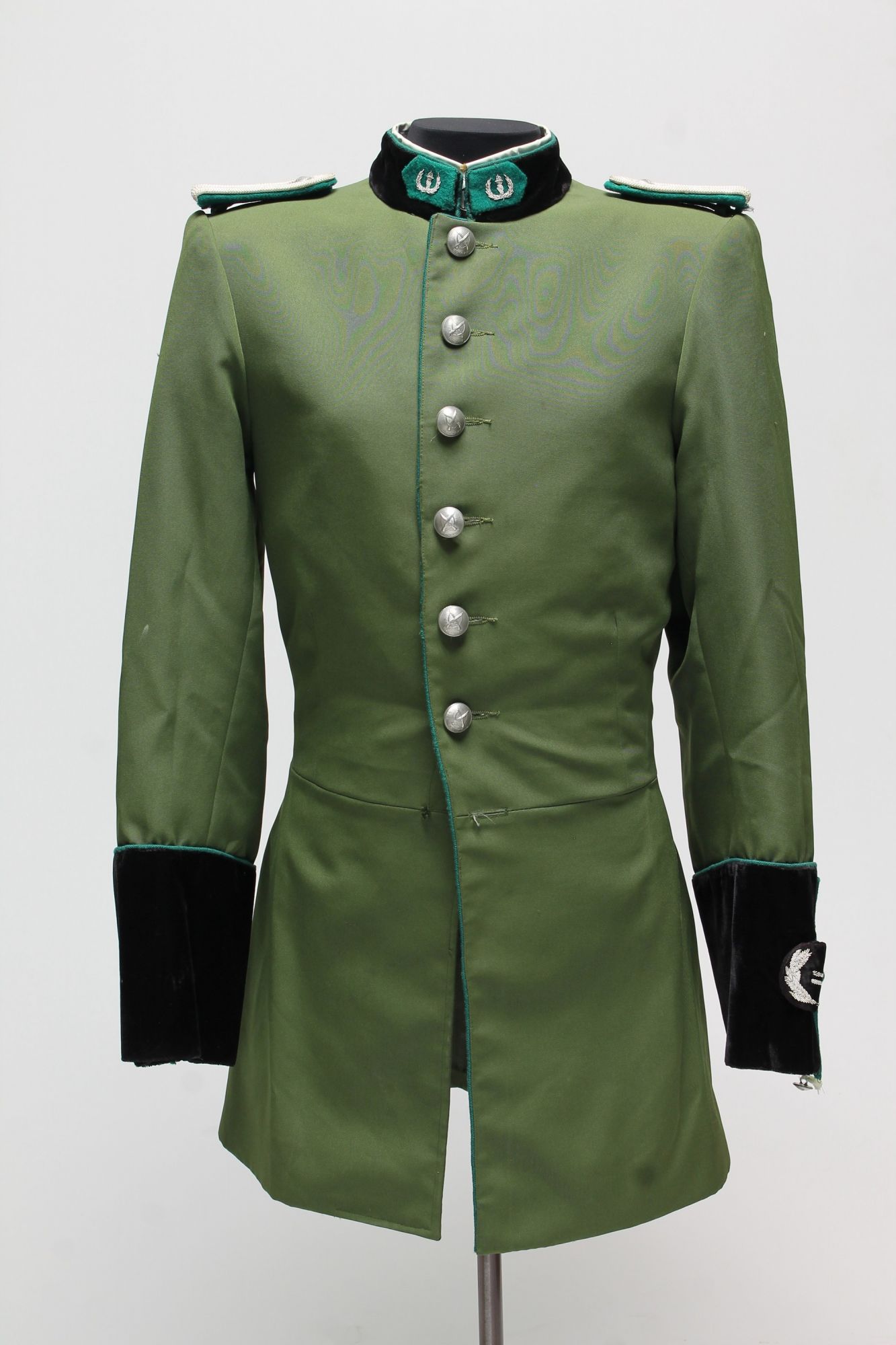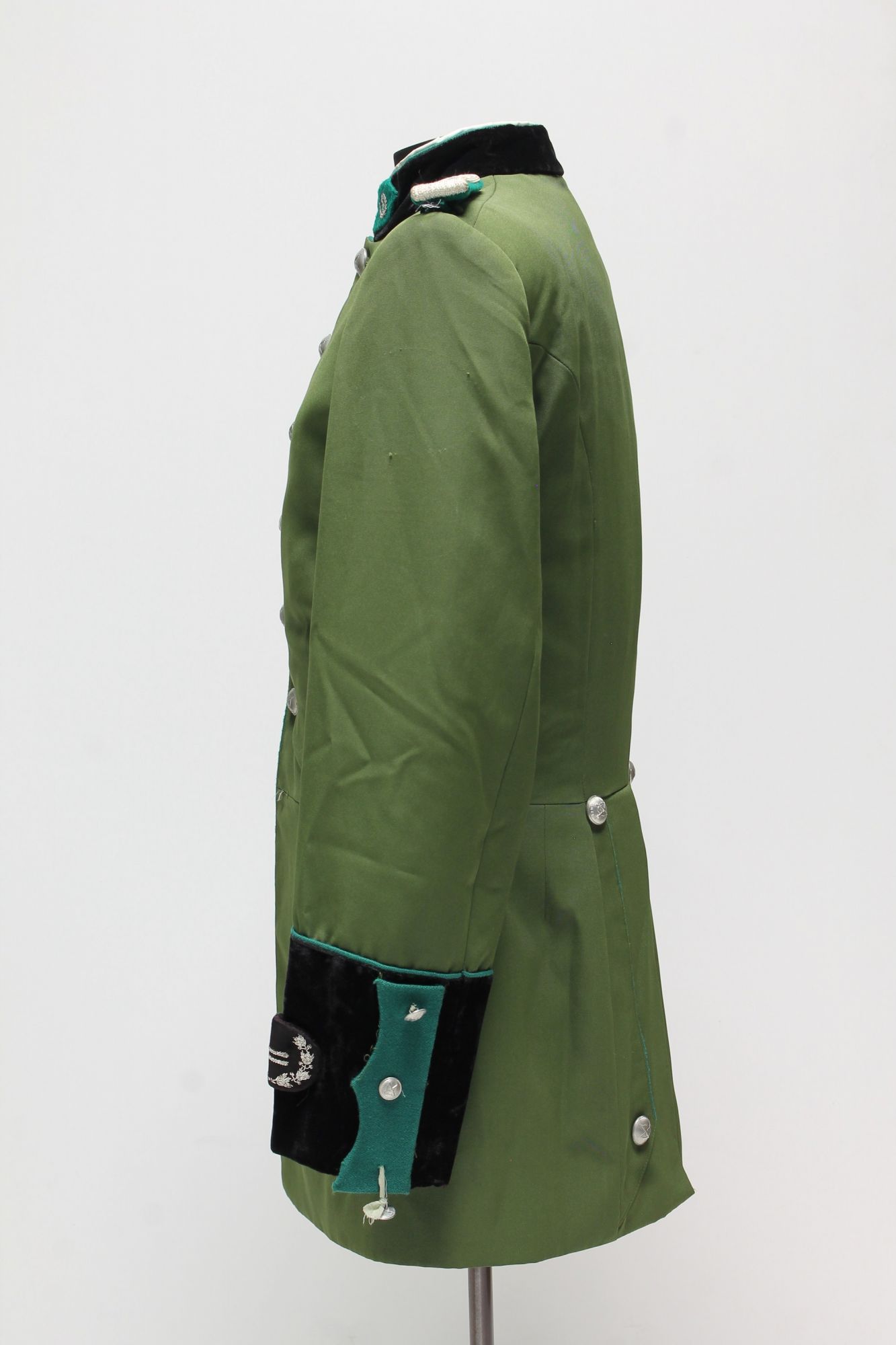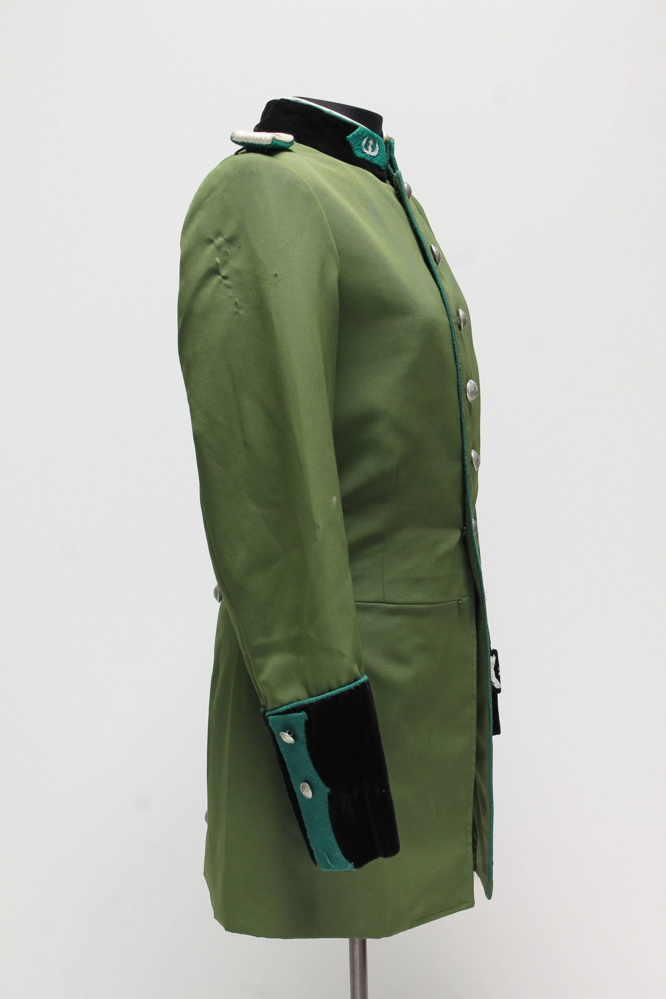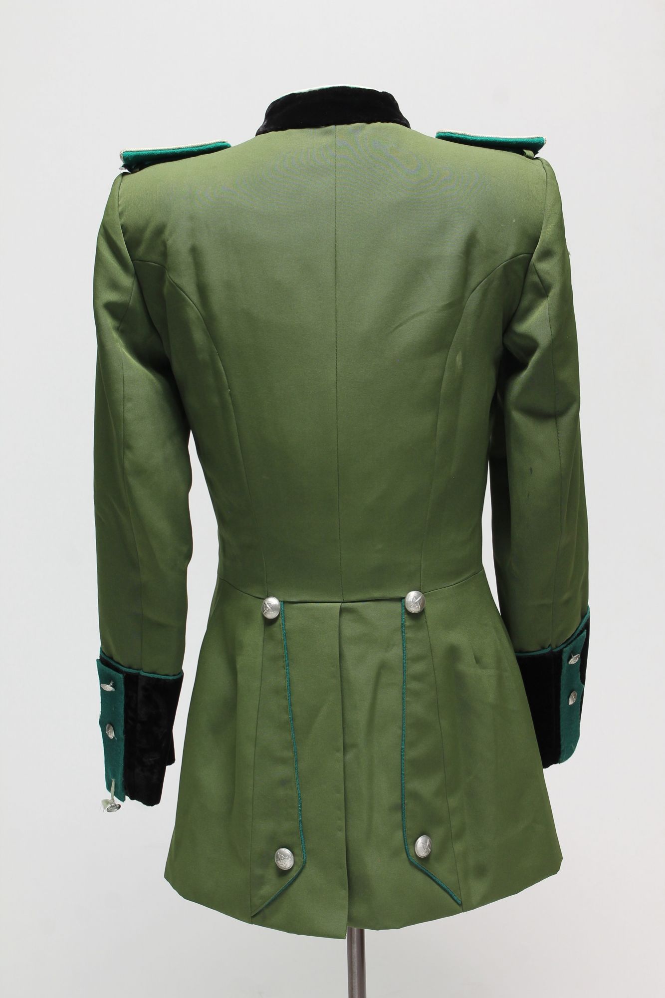 Guerrera de color verde, con cuello cerrado de paño negro, lleva parche verde de paño, con insignia de la Academia bodado en hilo plateado. Sobre los hombros presillas de hilo color plata, sobre paño verde, afirmados con boton chico. Botones de color metal blanco con insiginia de carabinas cruzadas. Falta un botón grande, y uno chico en la manga derecha. Los puños son de paño negro hasta la bocamanga, con vivos de paño verde y botones pequeños.
