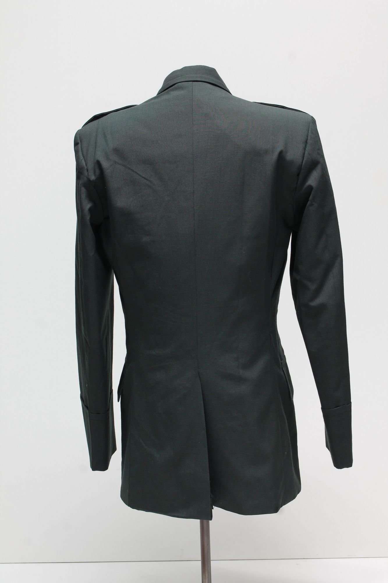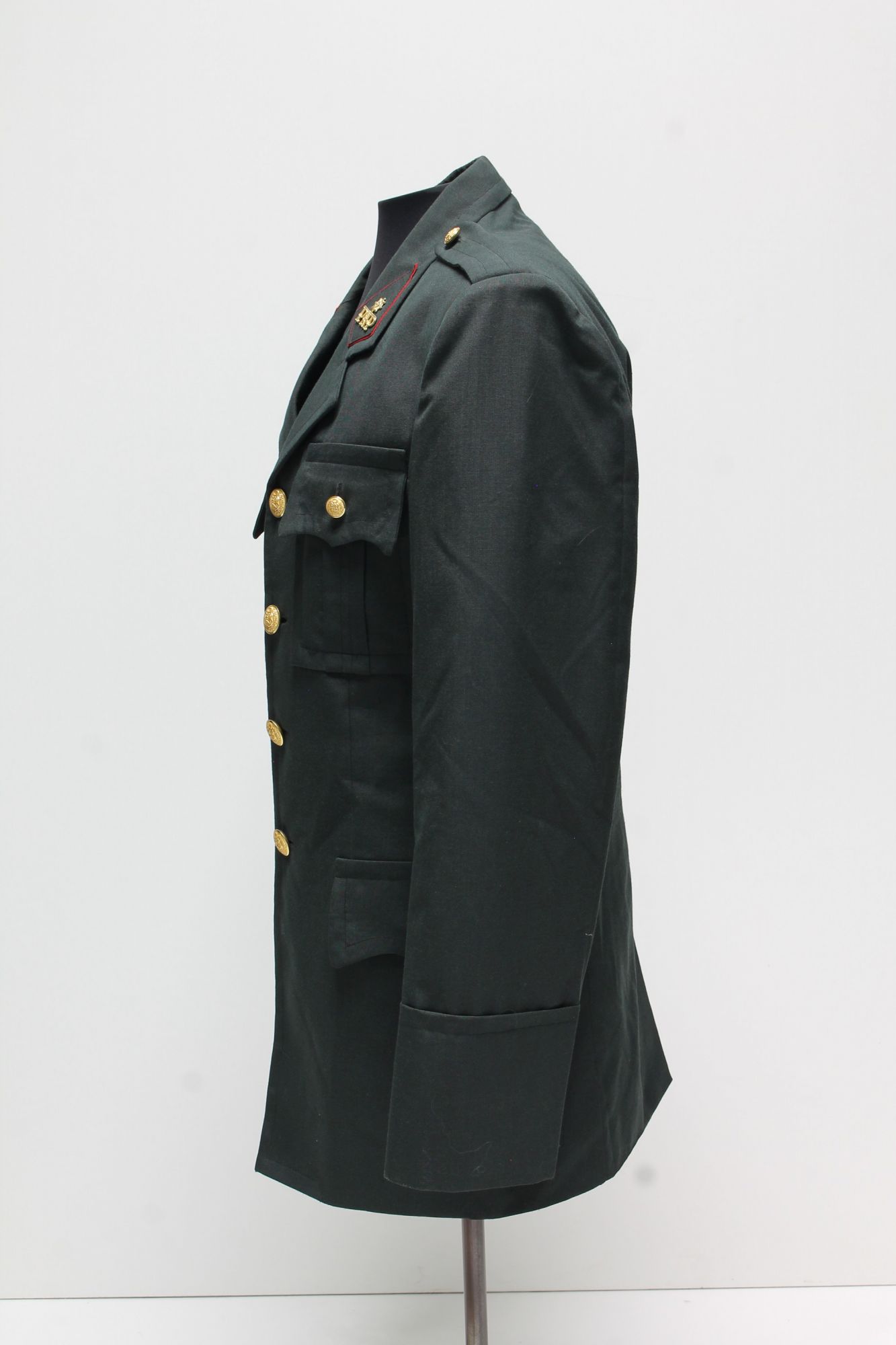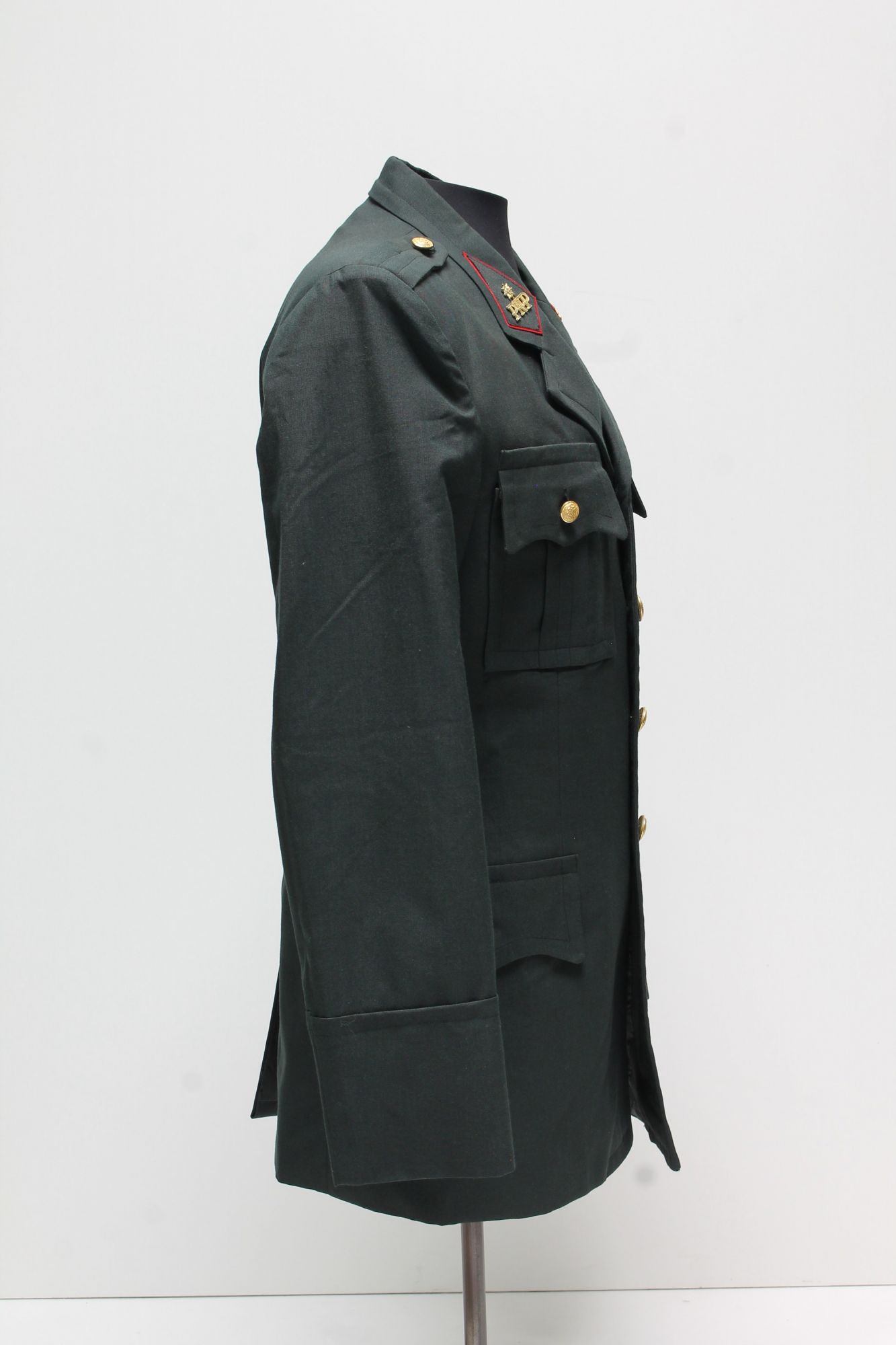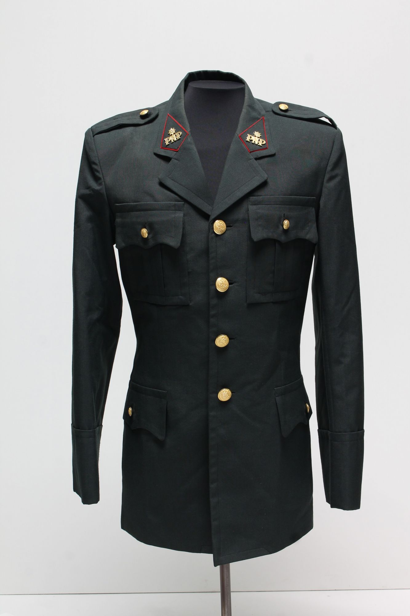 Blusa de gabardina color verde azulino que lleva botones en metal amarillo con escudo nacional. Cuatro bolsillos. Sobre las solapas en un parche del mismo materia de la blusa pero con orilla roja con forma de un rombo alargado e invertido va en metal amarillo el monograma institucional con las letras PNP bajo un sol. No tiene insignias de grado.