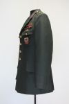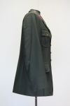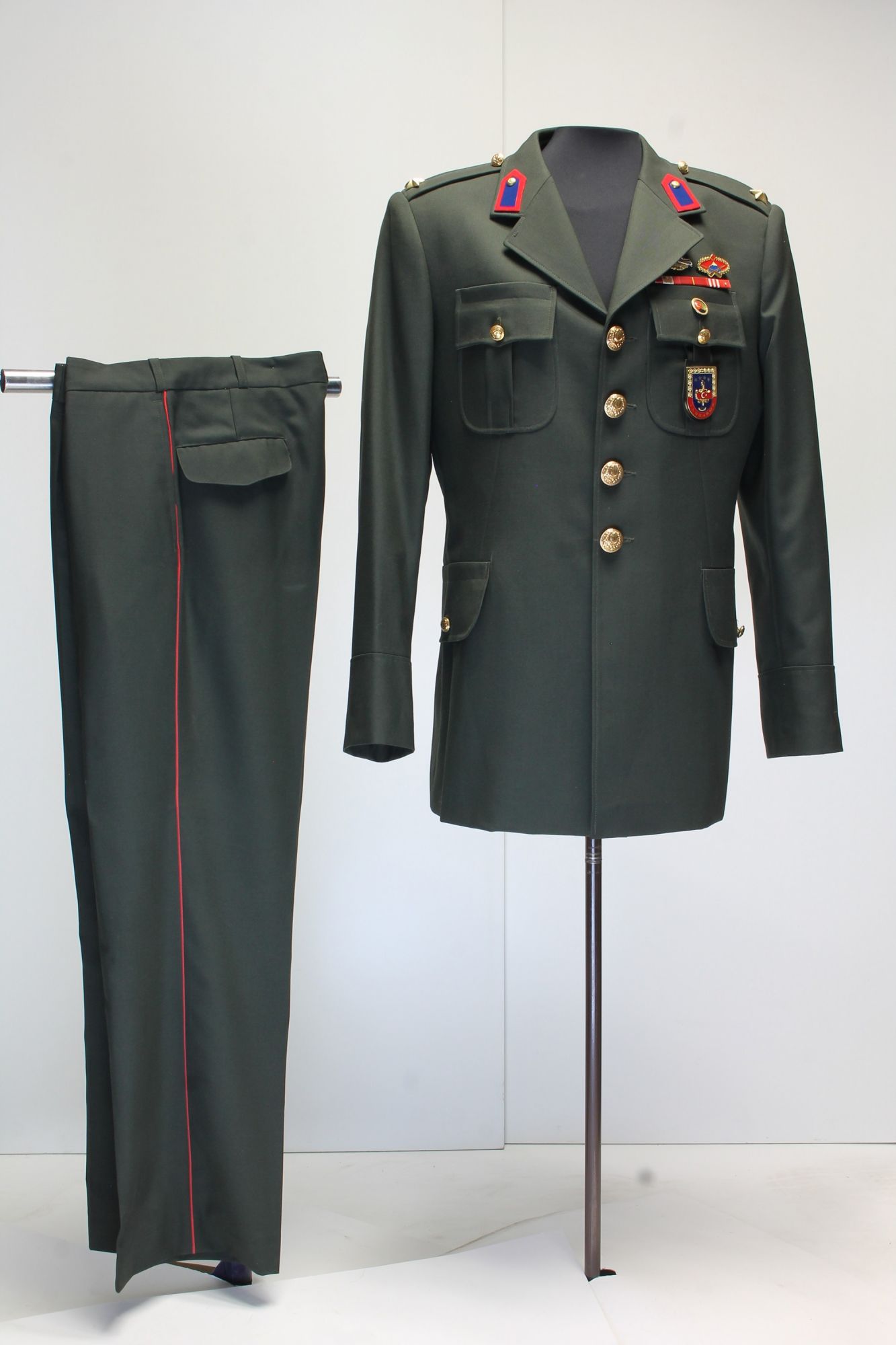 Blusa de gabardina color verde oscuro con cuatro bolsillos grandes y botones de color metal amarillo. Sobre las solapas en forma de pentágono alargado van unos parches de color azul sobre rojo con un botón. Sobre las presillas el grado del oficial, y sobre el bolsillo izquierdo superior, miniaturas de condecoraciones y piochas de especialidades.