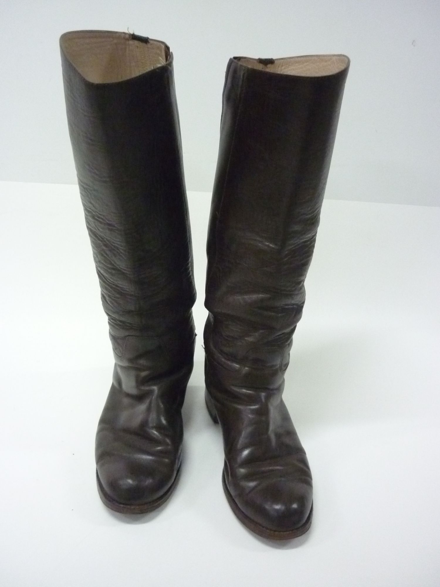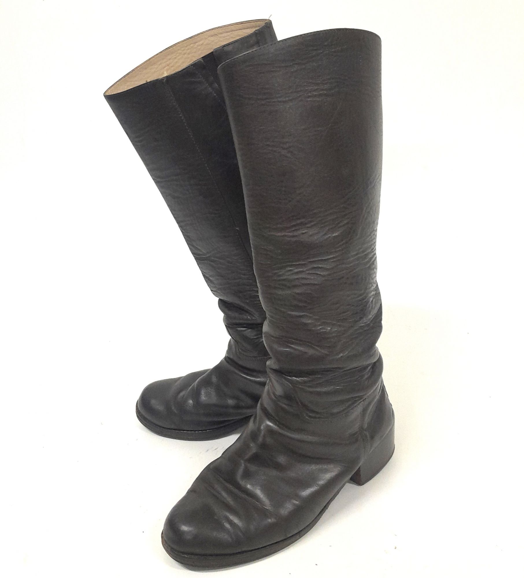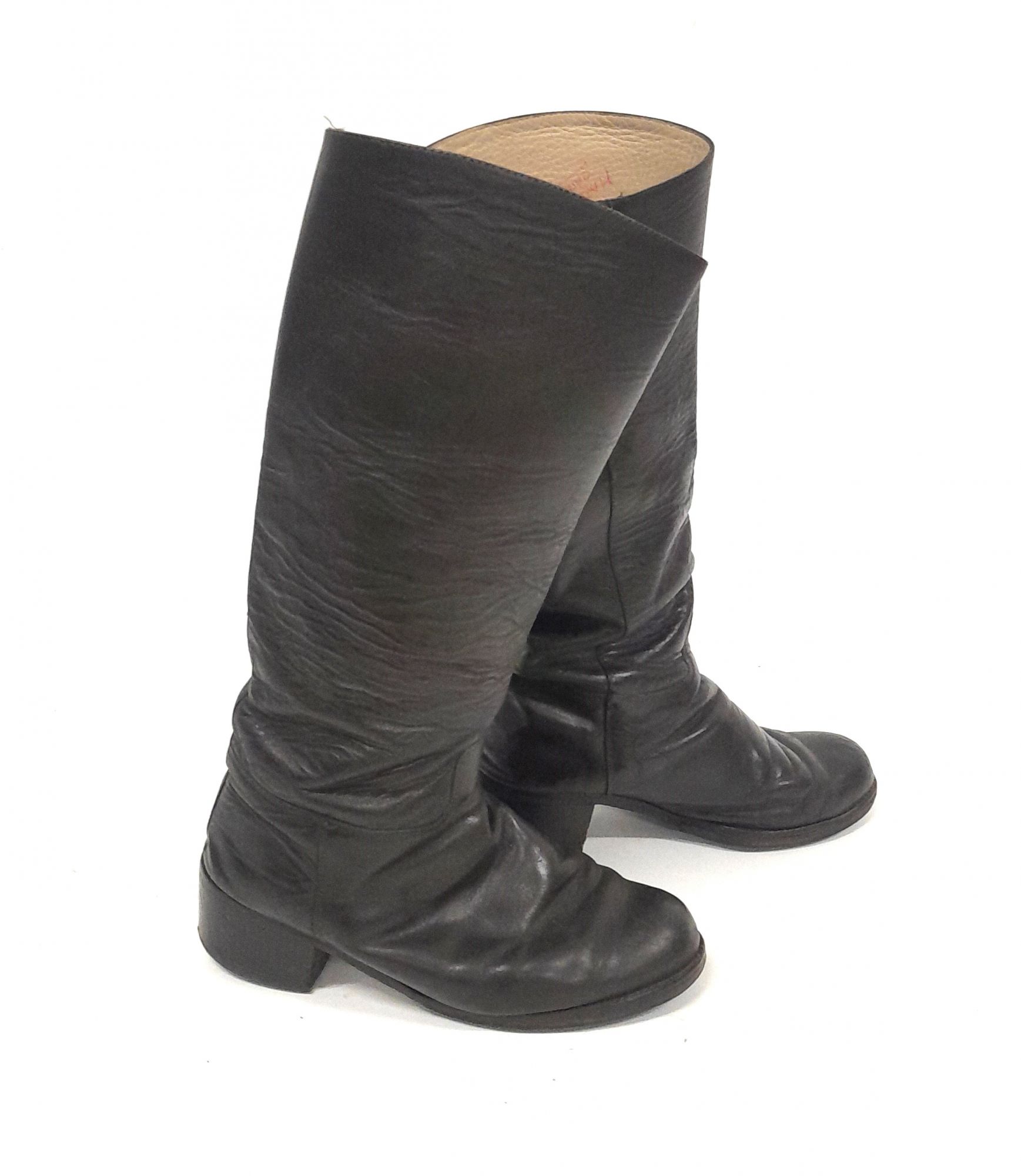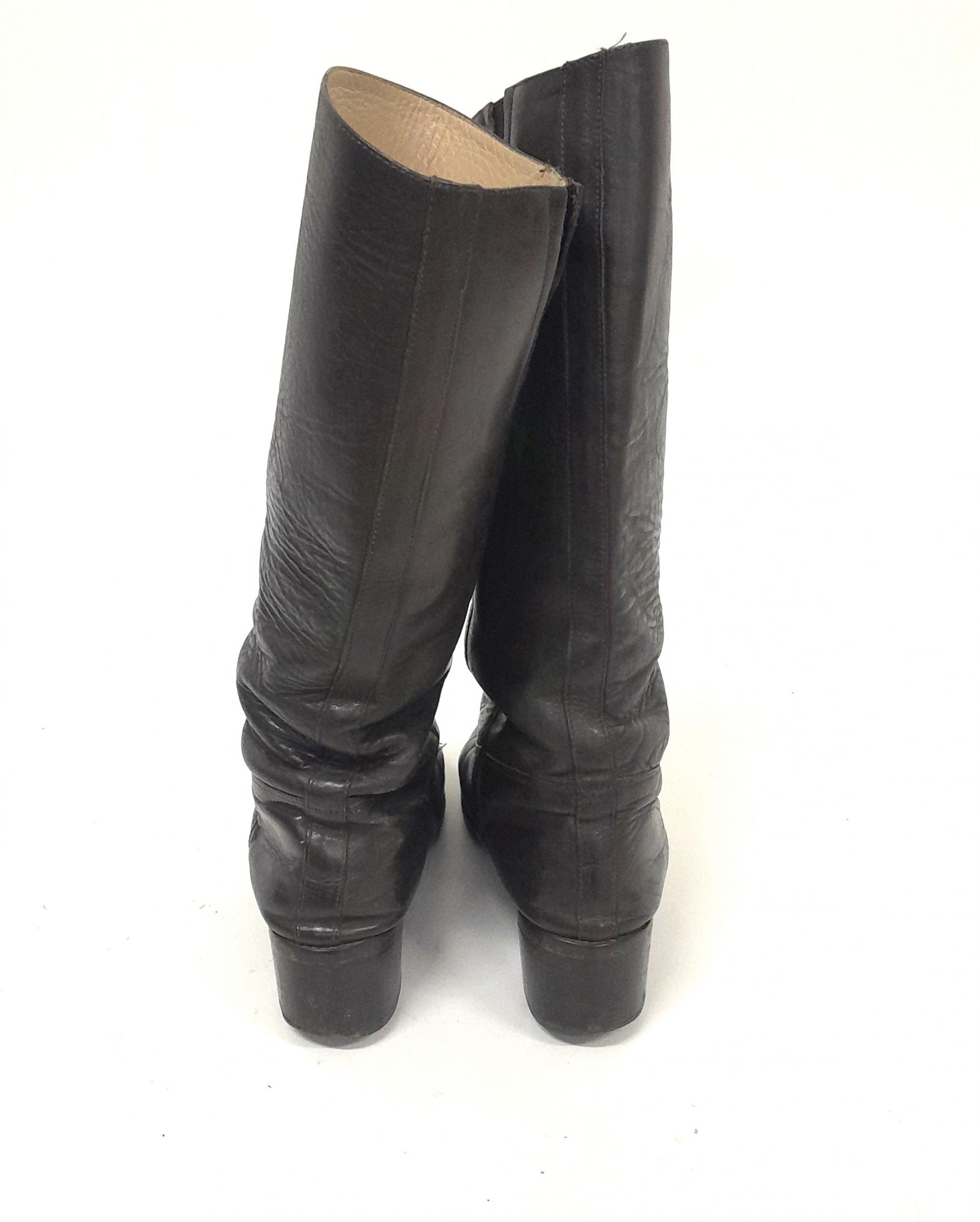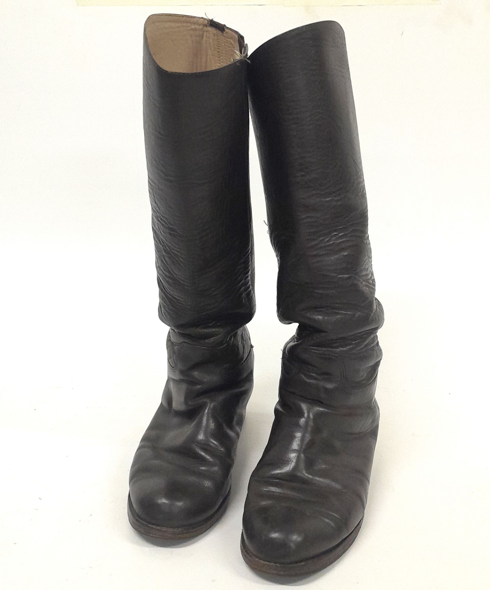 Par de botas femeninas, de cuero color marrón, de caña alta y punta redonda. En la parte interna desde la zona tobillo un cierre hacia la zona superior, color marrón. La planta es de suela, taco con tapilla y goma.