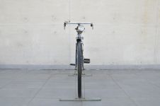 Vehículo de transporte de propulsión humana. Objeto compuesto por una estructura metálica de color negro, se erige sobre dos ruedas de caucho oscuro montadas en tándem. En la parte central posee un engranaje dentado con una cadena metálica y un pedal a cada costado, en la parte superior posterior un sillín de estructura metálica y resortes forrado en cuero, en la parte frontal un manubrio color metálico con cubiertas de plástico en los extremos y un foco.